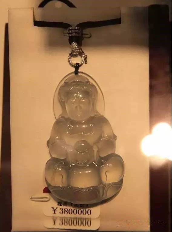 标价380万的翡翠观音,玻璃种,也是很厚实。其实这样的无色玻璃种,到不了这么高的价格,也就是50-60万。