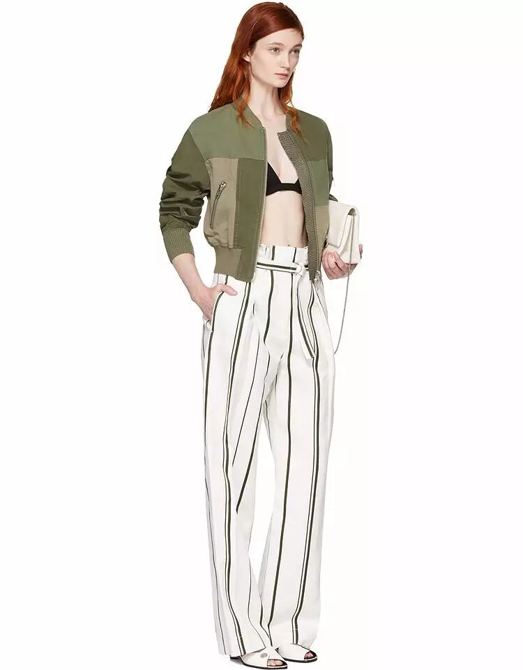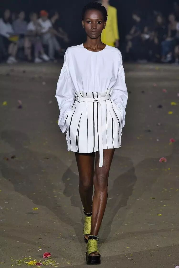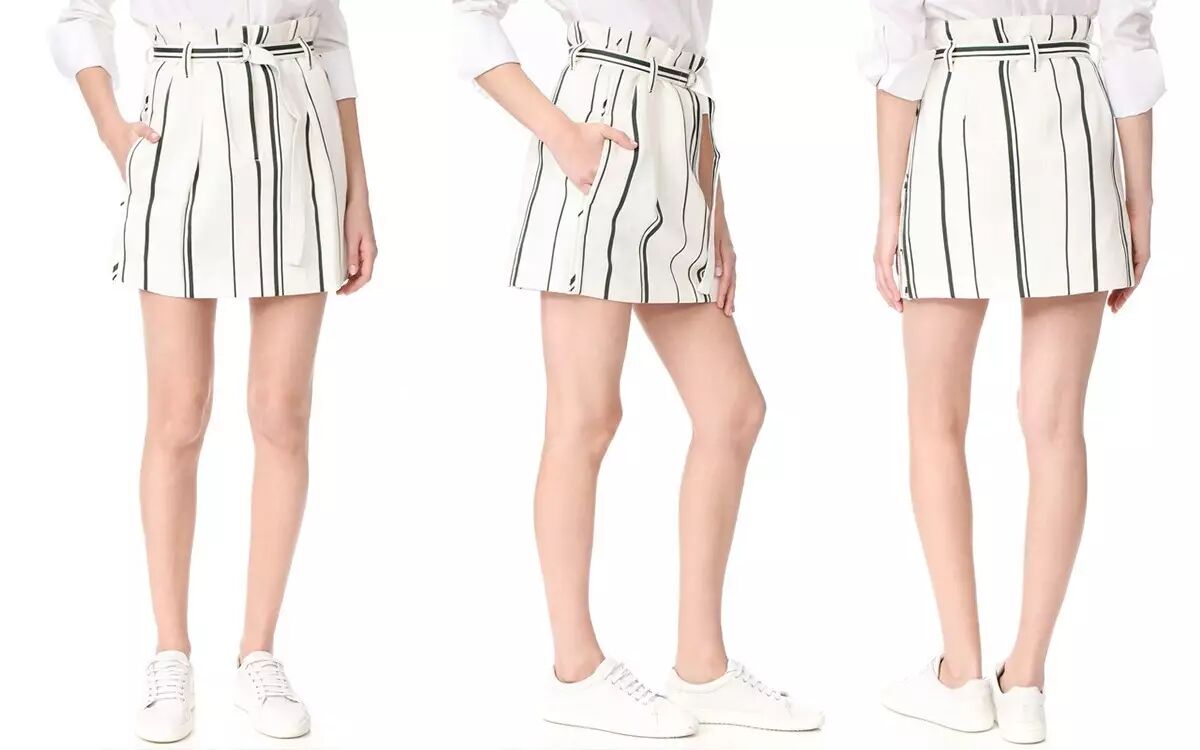 3.1走秀款,非常清爽的一款迷你裙,装饰有墨绿色的窄条纹。两侧饰有磨边片段,凸显轻微宽松感。可拆卸 D 型环腰带束紧腰身,缝骨口袋,钩眼扣和拉链门襟,贴心衬里。搭配简单白衬衫也已足够。