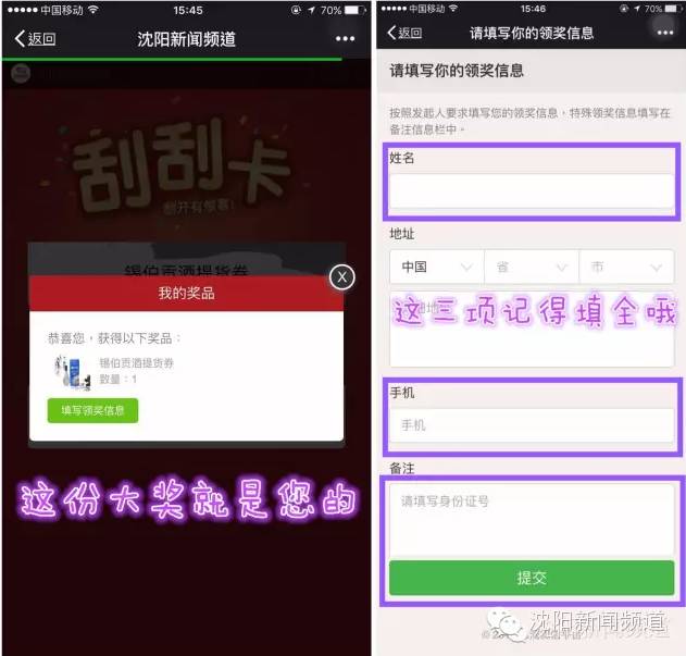 6、然后填写您的领奖信息,尤其是记得填上您的姓名、联系电话和身份证号哦。↑