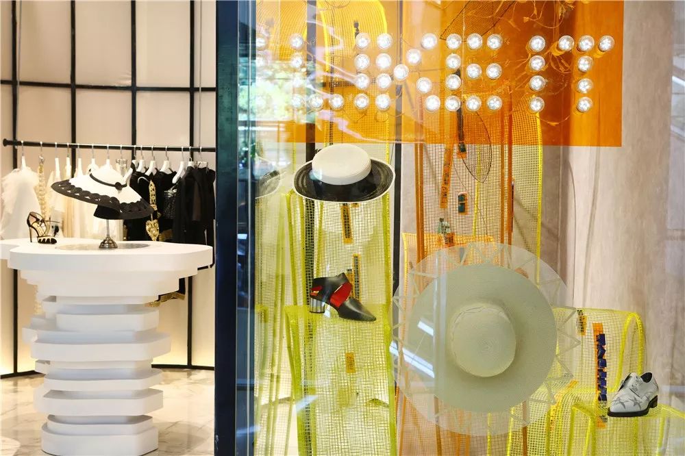 店里拥有高人气的艺术手绘墙来自新锐艺术家Lulu Wang,而天花板上的装置艺术则是与帽饰艺术家SUIYIDA的设计,灵感来自于中国神话传说中嫦娥极富美感和丰富元素的宫殿,就像神化版的时尚SHOWROOM。