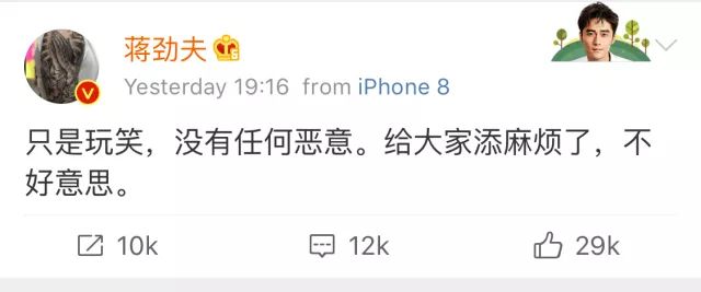 后面,他也在微博上澄清了这只是一个玩笑而已并没有任何恶意,并向大家道歉。