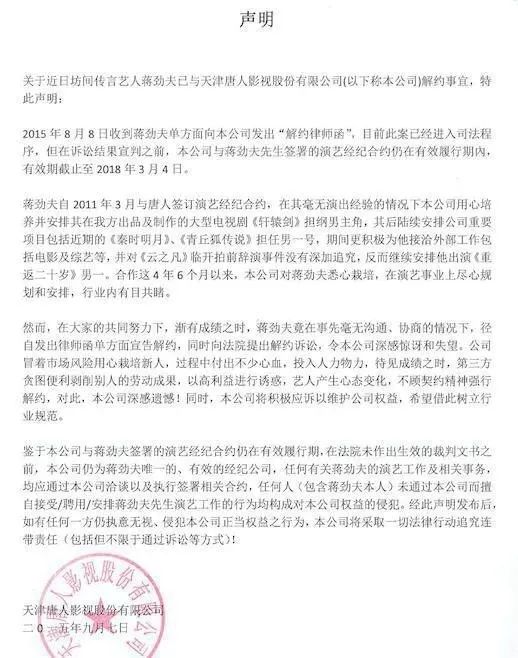 蒋劲夫不满于现状,认为是公司的不作为让他沦落至此,而后他就以“妨碍演艺发展”为由向唐人提出了解约。