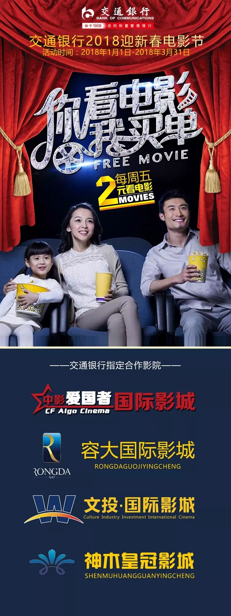 新年到了,交通银行特举办“2018迎新春电影节”活动,希望能在新的一年给您及您的家人带去更多欢声笑语!