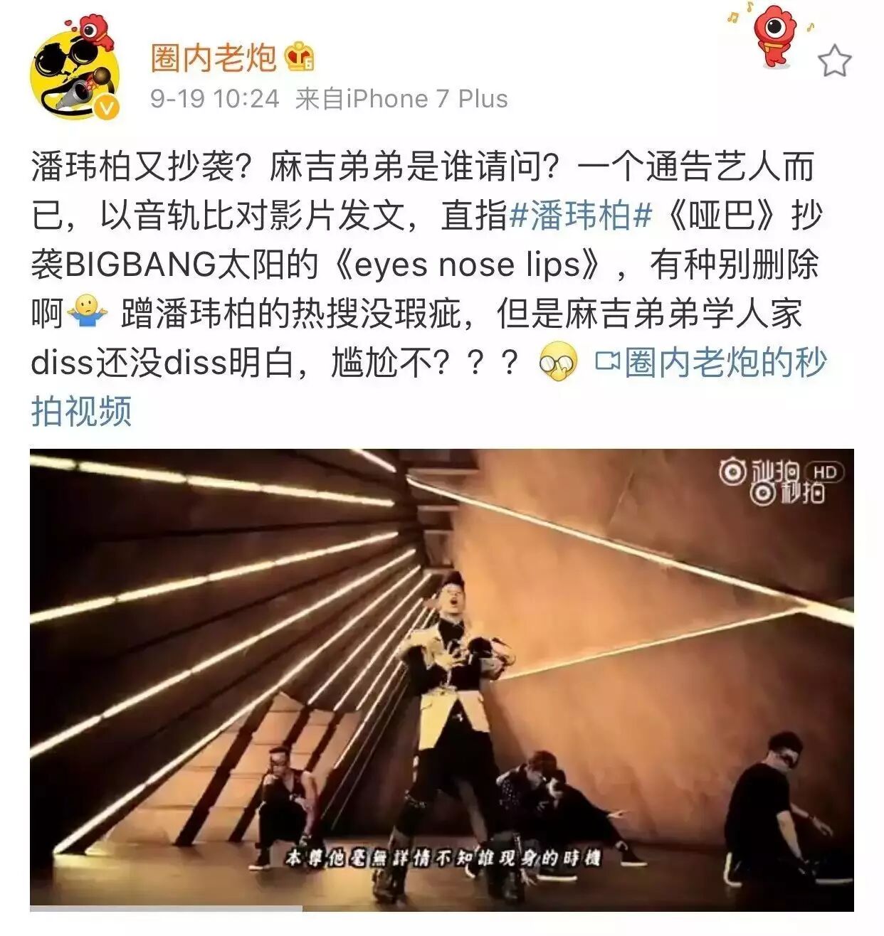 著名娱乐评论人圈内老炮表示:“潘玮柏又抄袭?麻吉弟弟是谁请问?一个通告艺人而已,以音轨比对影片发文,直指潘玮柏《哑巴》抄袭BIGBANG太阳的《eyes nose lips》,有种别删除啊[摊手] 蹭潘玮柏的热搜没瑕疵,但是麻吉弟弟学人家diss还没diss明白,尴尬不???”