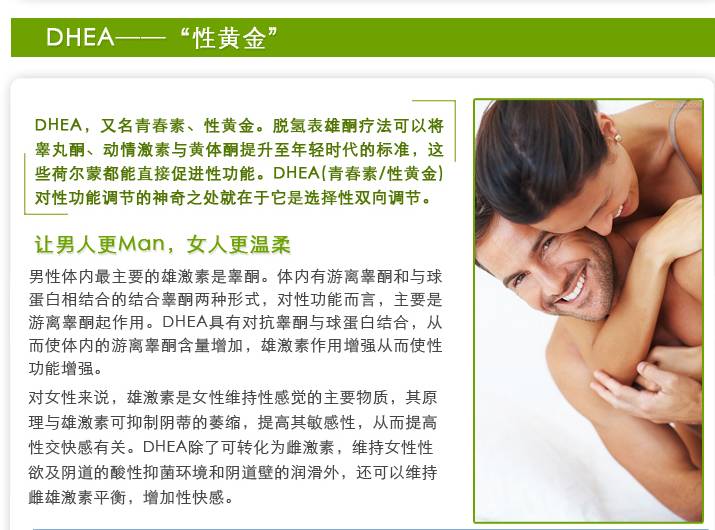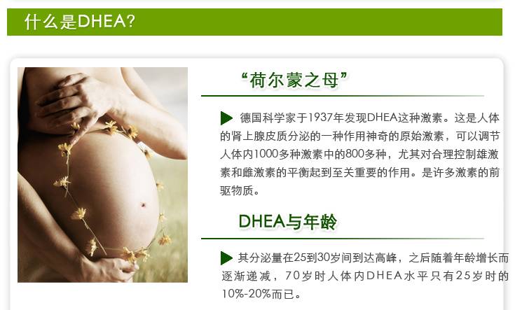 DHEA被医学界誉为“性黄金”、“青春素”、“激素之母”、“超级激素”等。可以调节人体内1000多种激素中的800多种,尤其对合理控制雄激素和雌激素的平衡起到至关重要的作用。