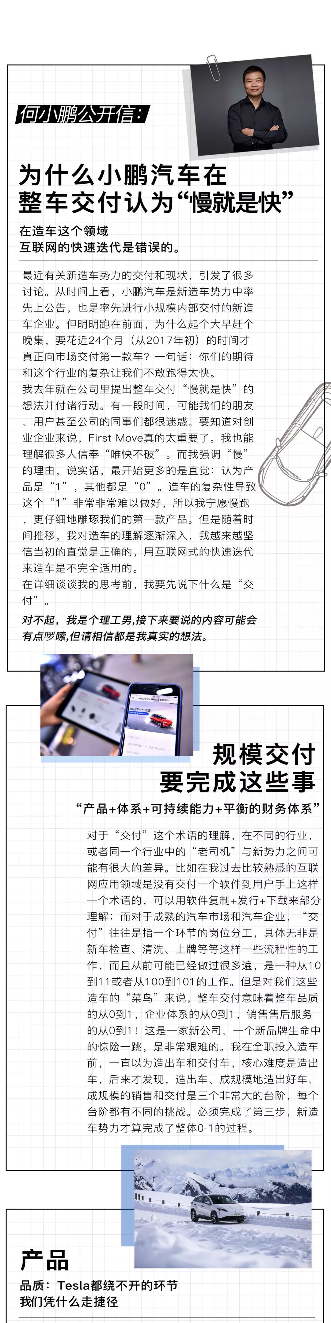 以下就是小鹏汽车董事长兼CEO何小鹏在广州车展期间的公开信全文,让我们一起来看看一家科技智能制造的“慢公司”到底是如何炼成的⬇️