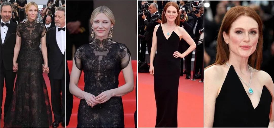 红毯上,虽然黑色是最safe的颜色,但不是所有人都敢穿黑色。因为黑色穿不好,就会不显眼,意味着媒体的镜头很可能抓不到你。然而这两位却完全没有这种担忧——一个是主竞赛单元评审团主席凯特•布兰切特(Cate Blanchett),另一个是影史上首位获得欧洲三大电影节(戛纳、威尼斯、柏林)和奥斯卡金像奖影后大满贯的女演员朱丽安•摩尔。