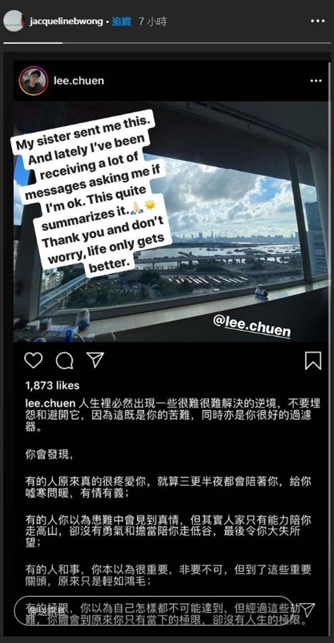 就在许志安复工见记者后的几个小时,黄心颖在IG上转载了网络爱情作家李专的心灵鸡汤文: