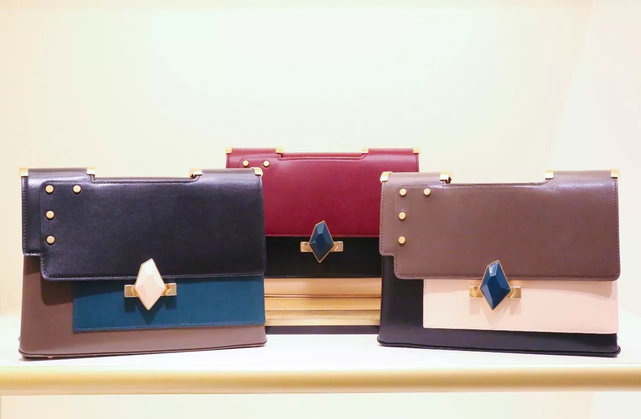 这款包的菱形扣件真的很抢眼,不规则的形状和多面切割,有一种宝石般的神秘感,拼色和铆钉的设计也极具设计感。