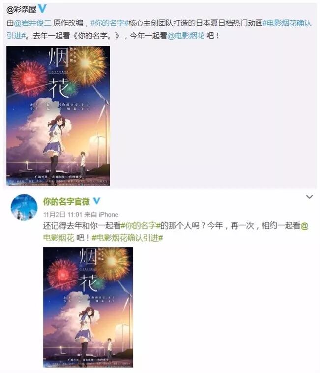 《烟花》在宣发上很适宜的借用了前辈的名号,“去年一起《你的名字》,今年一起《烟花》”的宣传刷遍票圈