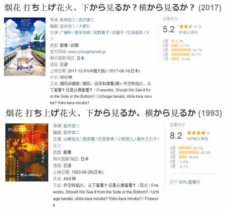 豆瓣上,《烟花》动画版评分5.2、真人版评分8.2
