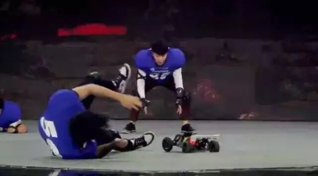 当时他更换帅气的橄榄球服之后,却站在出场口卻不愿意重新出场!为什么呢?原来的这个项目,要求的是李茂率领杨凯杰、谢波两人要在三分钟的限时之内,以进攻、飞扑、卧抱等方式拦截住一台遥控汽车。这辆车是由职业遥控汽车赛车手朱明辉所遥控,驰骋速度之快连训练有素的军犬都追不上!