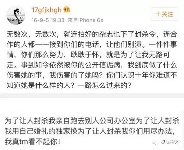 去年,张馨予微博小号被曝光,这个厚积薄发卧薪尝胆的小号,通篇都在控诉范冰冰李晨封杀她,打压她,甚至不惜用婚礼独家交换媒体打压张馨予的筹码。