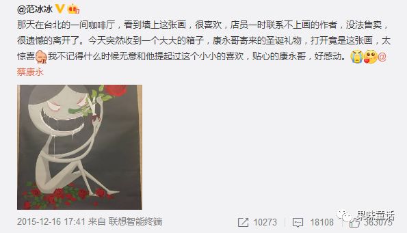 当天范冰冰也放出了玫瑰和女孩图,只不过女孩变成了魔鬼,玫瑰也被剪断了。