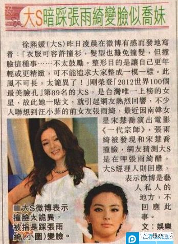 后来宋慧乔因出演《一代宗师》,被人说和张雨绮撞脸的时候,大S也发微博称:撞衫可以,撞脸就尴尬了!