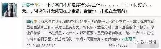 之后张馨予就展开了和吴卓羲互相指责彼此出轨的狗血剧情,直到8月,张馨予微博公开和李晨确认了男女关系,她和吴卓羲的剧情才告一段落。而热恋中的新人,彼此多么甜蜜,在李晨眼里,张馨予"真实得像个孩子"。