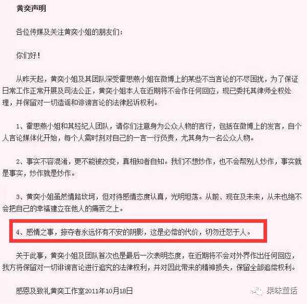 其实黄奕的前前夫姜凯确实不认识霍思燕,通稿上黑的霍思燕是因为另一个男人杨溢,在和黄奕恋爱五年的时候,突然出现了霍思燕。杨溢后来承认:“我对不起黄奕,但我真的爱霍思燕。”这句话成为了黄奕大面积传播霍思燕小三传闻的导火索。
