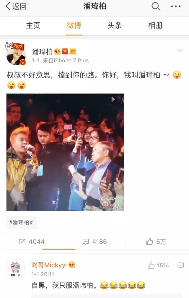 在今年跨年晚会上,潘玮柏居然偶遇了“错愕大叔”,而之后更是在微博上玩起了自我调侃称“不好意思,挡到您了”,论自黑我们只服潘玮柏!