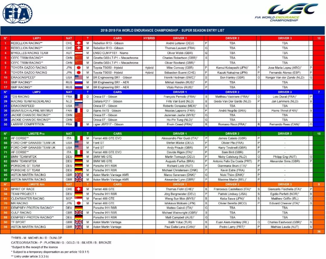 【2018/19世界耐力锦标赛超级赛季参赛名单】