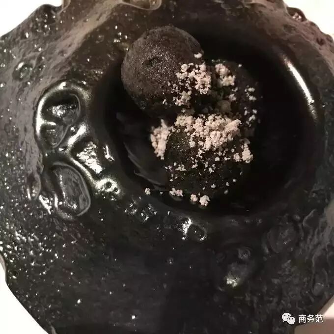 范主最最好奇的那颗确实是个名副其实的黑!球!其实它是炭包裹着金枪鱼做成的一道炸丸子,范主觉得这道菜和它的菜单表情简直神同步~