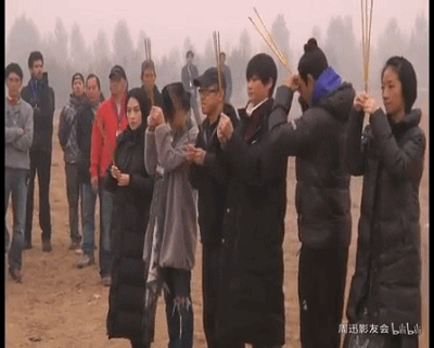 《龙门飞甲》开机仪式,导演演员烧香拜拜。范晓萱就懵的,该干嘛怎么做,不懂,紧贴在老姐身边,时不时瞥她,跟着做。“还要拜吗?”“拜,向右转。”