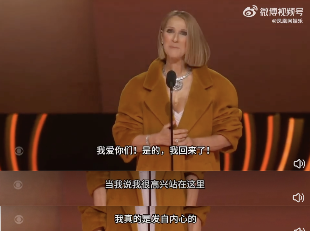重新回到格莱美典礼的席琳本人也非常激动,发言时几度哽咽。“我回来了!”“当我说我很高兴站在这里,我真的是发自内心的。”“那些有幸出现在格莱美颁奖典礼的人,绝不能认为音乐给我们的生活和全世界人民带来的巨大的爱和快乐是理所当然的。”