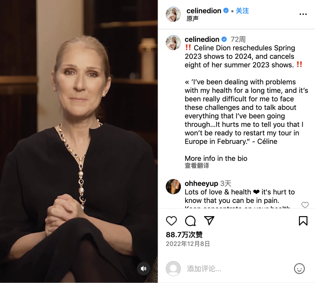 (2022年底,她在自己的社交媒体上以英语和法语分别录制了两段视频,告诉大家自己不得不因为自己的健康原因取消2023年的巡演。“不幸的是,肌肉痉挛已经影响了我生活的方方面面,有时会让我走路困难,有时会让我无法用声带像之前那样歌唱。”)