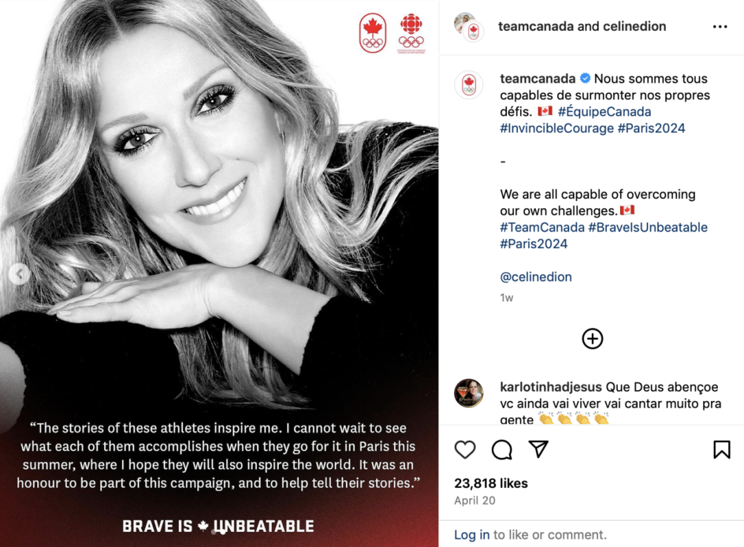4月下旬,席琳·迪翁又令人惊喜地出现在加拿大奥委会推出的《勇者无敌》系列宣传片中,为该片贡献法语旁白。这一宣传片为巴黎奥运会预热,讲述的是几位加拿大运动员如何克服重重障碍、通往奥运道路的故事。邀请席琳·迪翁来出演旁白,还配上“我们都有能力克服各自的障碍”这样的文字,也算是加拿大奥委会的用心表白了。
