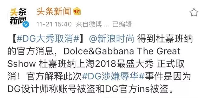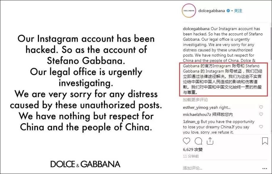 D&G的官方ins和官方微博也发布道歉声明,称其官方账号和设计师账号均被盗,为这些不实言论给中国和中国人民造成的影响和伤害道歉,并强调对中国和中国文化始终保持热爱与尊重。