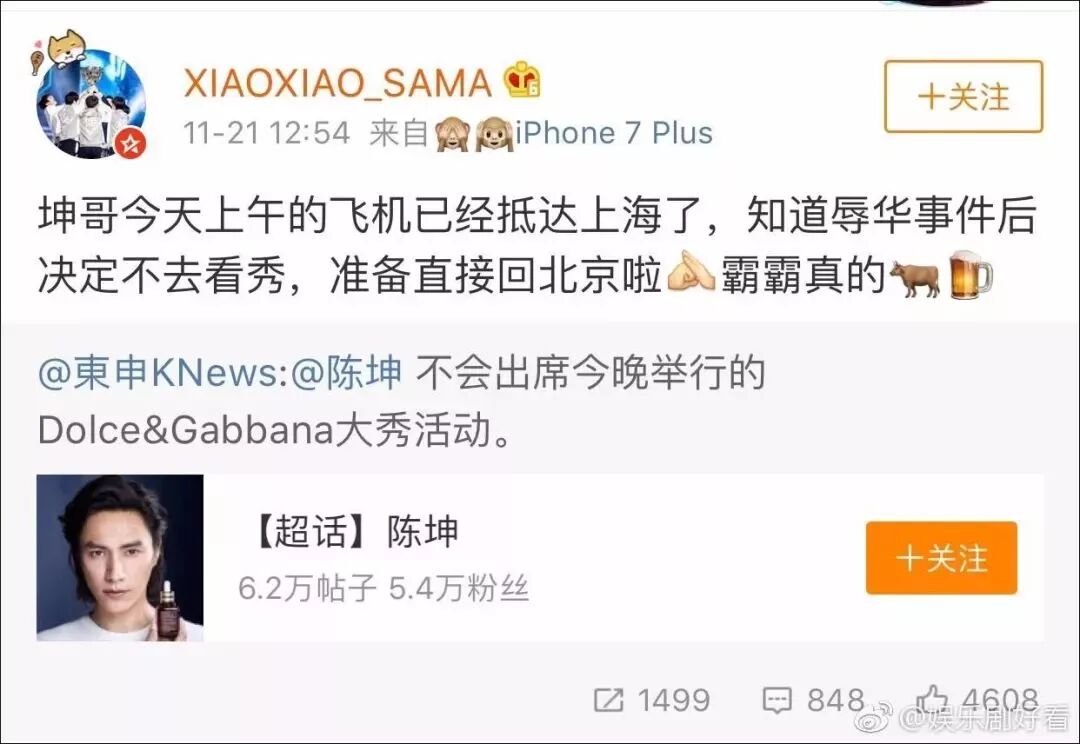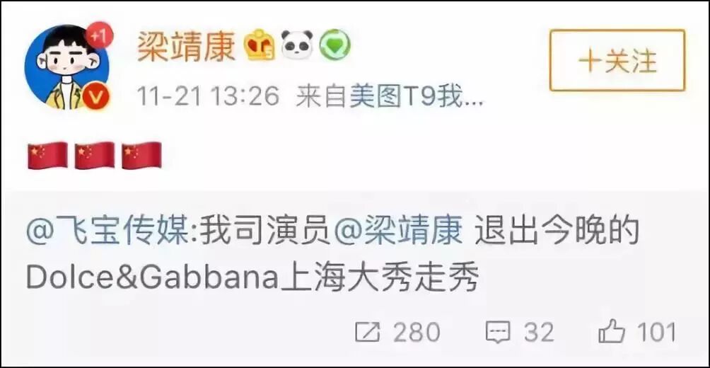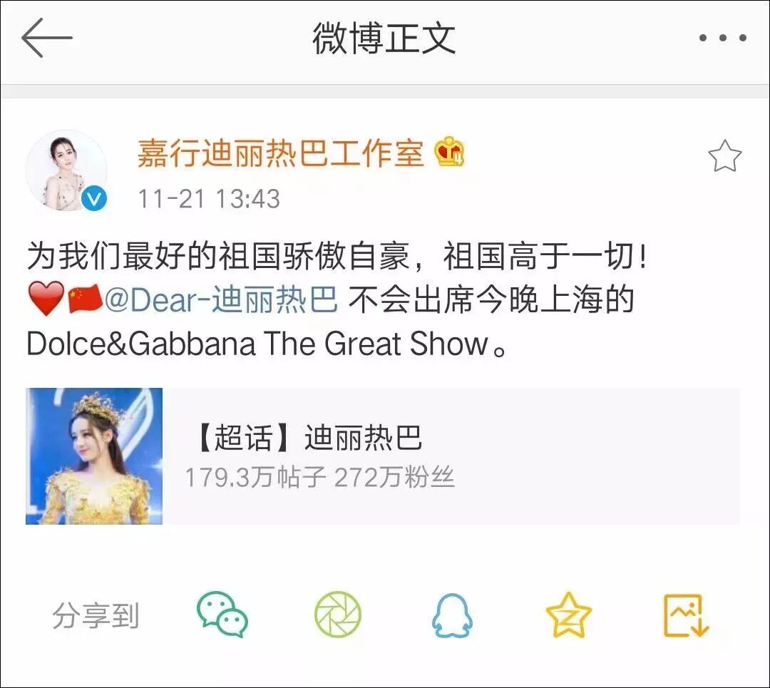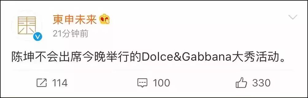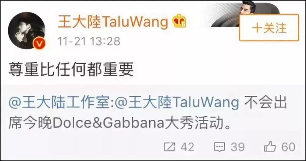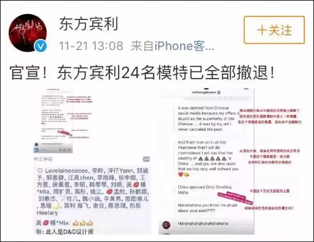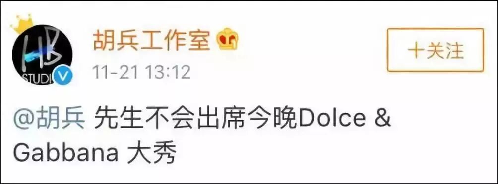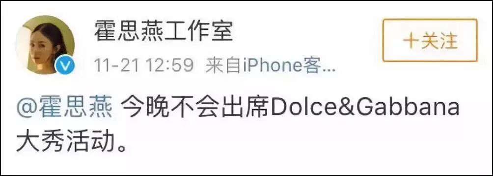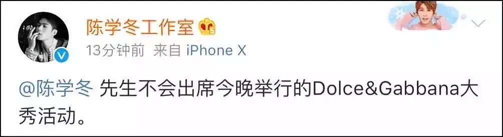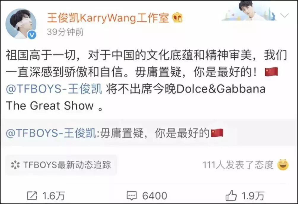 李冰冰、黄晓明、王俊凯、霍思燕,以及D&G代言人王俊凯和迪丽热巴等中国艺人,东方宾利等中国模特公司,纷纷在微博发声,宣布不会出席今晚的时装秀。