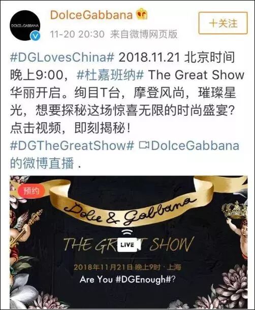 微博上目前还高挂这这场大秀的广告,相关话题是#DGLovesChina#,活动邀请了许多中国艺人参加走秀和看秀。