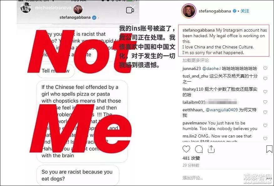随后,设计师Stefano Gabbana在ins上道歉,称自己之前的言论是因为账号被盗:“我很喜欢中国和中国文化,对于发生的一切我感到很遗憾。”