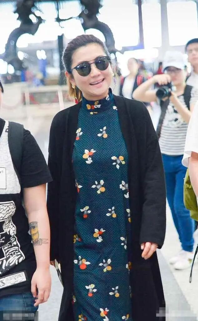 任家萱这审美也太不稳定了吧,在线的时候怎么看都是优雅可爱的小姐姐,但是翻车的时候这审美连大妈都嫌弃啊,印花长裙款式暗淡就算了,直筒型完全没有收腰,更是显出了水桶身材,配着黑色外套看着就更加老气了耶。