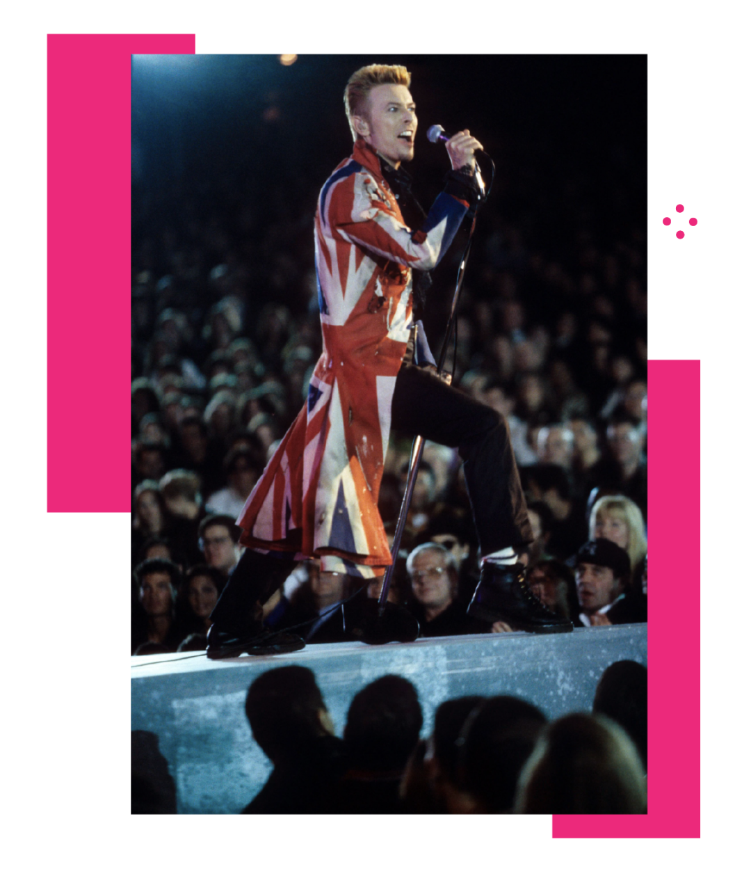 1996 年 David Bowie 找到崭露头角的 Alexander McQueen 为其《Earthling》巡演设计服装,其中可见 Bowie 穿着由 Alexander McQueen 创造的 Union Jack 大衣。这件据说灵感来自音乐人 Peter Townshend 和 Gavin Turk 画作《Indoor Flag》的英国米字旗大衣,不仅获得了 David Bowie 的喜爱,以至于再度穿着它拍摄了《Earthling》专辑封面,更掀起了一阵风潮。