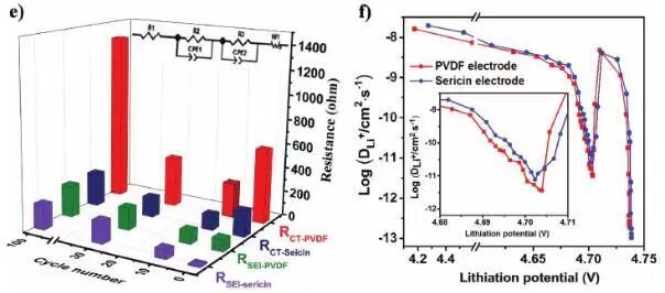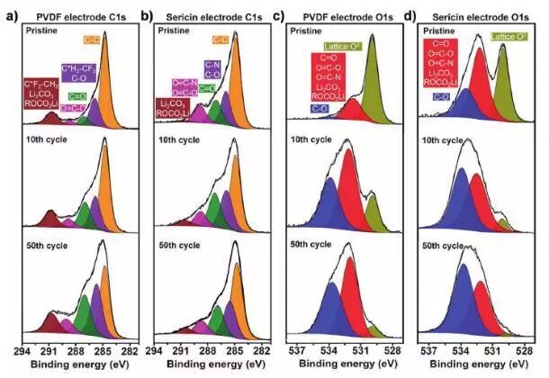 在以锂镍锰氧为正极材料的锂离子电池测试中,研究人员发现丝胶蛋白作为粘结剂的锂离子电池表现出了比PVDF更好的电化学性能,这种优势会随着充放电速率的增加而进一步扩大。在1C的充放电速率(1h)下,丝胶蛋白电极具有121.2 mAhg-1的容量,PVDF电极具有111.8 mAhg-1的容量,性能差异不大。而当充放电速率达到5C时(10 min),丝胶蛋白电极仍有91.8 mAhg-1的容量,作为比较,PVDF电极在该速率下的容量为28.5 mAhg-1。这也揭示了丝胶蛋白作为粘结剂时,能够给予电极材料更好的倍率性能,该发现也为超快充放电的研发提供了新的启发。研究人员同时还研究了该丝胶蛋白对高压电极材料自放电现象的遏制能力。结果显示丝胶蛋白(10%含量)电极能够在4.7 V的开路电压保持近180小时,且增加丝胶蛋白的含量可大大提供其电压稳定时间(> 600 h),而PVDF电极在不同含量下在4.7 V 保持约20小时后便迅速下降到3.5 V左右。该发现表明丝胶蛋白能够有效遏制高压电极材料的自放电,从而提高电池的容量和循环寿命。为了进一步揭示这一优异性能的背后机理,研究人员还对不同循环阶段电极材料的X射线光电子能谱(XPS)进行了具体分析,XPS分析发现,在不同的循环阶段,丝胶蛋白的固体电解质膜层的成分,相比于PVDF电极更加稳定。电化学阻抗分析同时表明丝胶蛋白粘结剂的电极具有更加稳定的材料界面,具有更小的锂离子扩散能垒(26.1 kJ/mol),PVDF电极的锂离子扩散能垒为37.5 kJ/mol,这也从机理上揭示了丝胶蛋白的优势所在。相关工作发表于Advanced Materials上。
