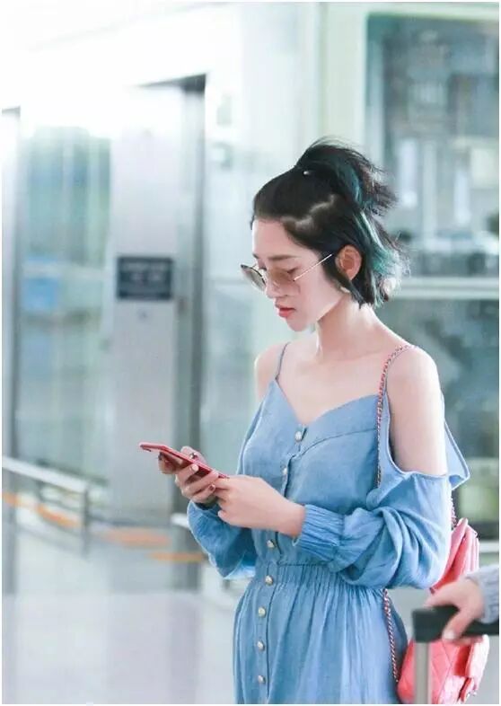 甜美的短发挑染几抹绿色,显得更加俏皮。搭配一件蓝色v领吊带纽扣长裙,清新自然邻家感十足。