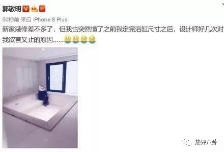 就在昨天,已经很长时间没有发更博的郭敬明,突然晒了张自己正在装修新家照片,还发文写道:“新家装修差不多了,然后我突然懂了之前我定完浴缸尺寸后,设计师几次对我欲言又止的是为什么......”。引得一大批吃瓜群众们的围观。也许是感觉自己有点太拉仇恨了,发完后又马上删除了这条微博,但是万能的吃瓜群众拼的就是手速,还是把这条微博截图了。