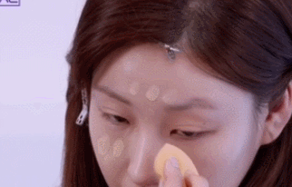 首先我们化一个无暇底妆,将粉底液和遮瑕产品以1:1的比例混合。然后均匀点涂在脸上。