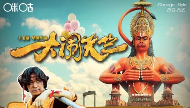 王宝强身穿黄色武僧服,戴着红色头带与猴子吊坠,用大笑、吃惊、吐舌、疑惑等各种表情演绎了一个重情义的“小人物武空”。