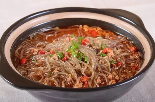 2、锅入芽菜油30克烧至五成热,下入姜末、蒜末各5克、郫县豆瓣碎10克、泡椒碎6克小火炒出红油,倒入芽菜汤400克,调入鸡精3克、白胡椒粉2克、白糖4克、陈醋5克,倒入红薯粉块翻匀,大火收汁,勾薄芡,起锅前撒入花椒面6克翻匀,装入热砂锅;