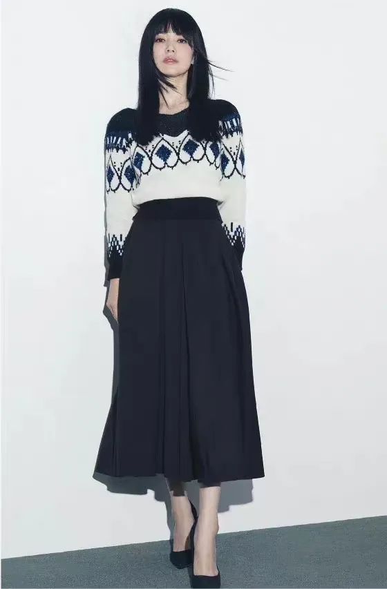 黑色大衣搭配长款半身裙休闲感和女人味兼备,酷飒中又带着几分浪漫;内搭上软糯的针织衫,则是温柔可人的模样。