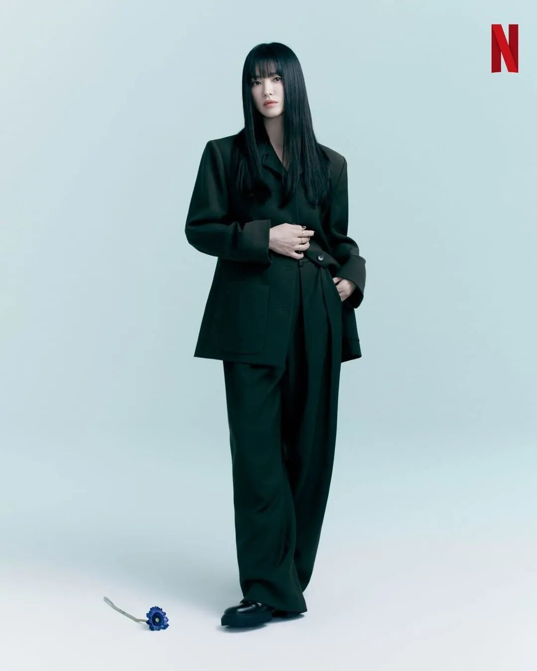 在剧中宋慧乔穿了两身黑色西服套装,身材娇小的乔妹喜欢穿这种带有垫肩设计的款式,有棱有角,很提气,搭上她犀利感极强的目光,无人能靠近的气场真是随时释放,这是黑色西装的强势感。