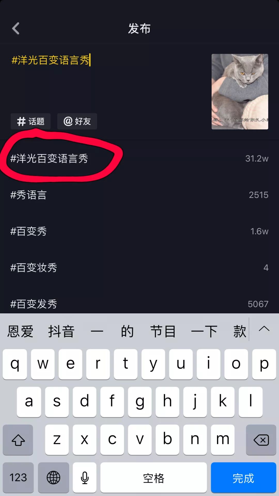 检查#洋光百变语言秀,@洋光外语@抖音小助手是否都完整,然后加上你自己想编辑的话,就可以发布啦~
