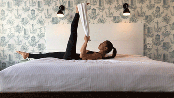 Step1:同样的,抓一个枕头靠近你的胸部并保持平衡,将左腿微微弯曲放在身后的床上;