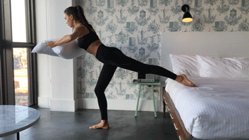Step1:两手抓住一个枕头以保持平衡,并把你的左腿伸直至你身后的床上,保证脚趾尖能落在床上;