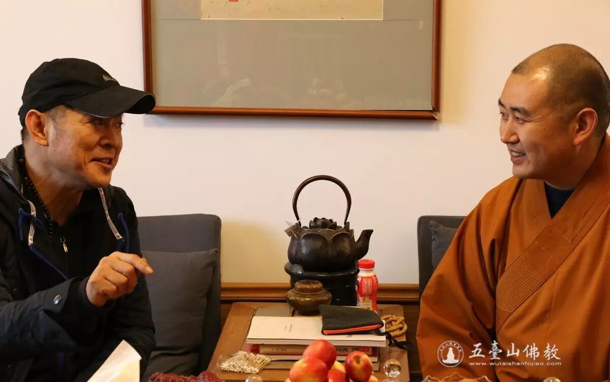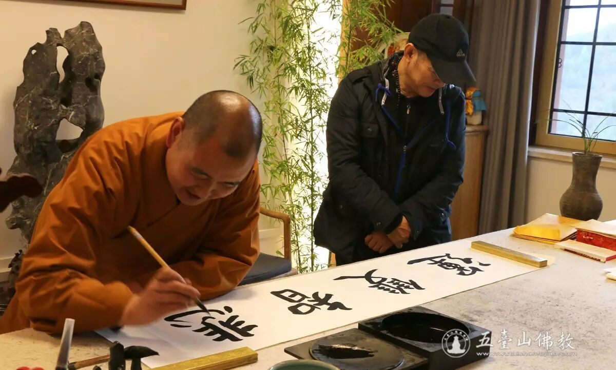 朝拜期间,李连杰先生与五台山佛教协会会长昌善法师进行了亲切交流。适逢李先生生日,昌善法师现场挥毫泼墨为先生题赠“悲智双运”墨宝以示生日祝贺。