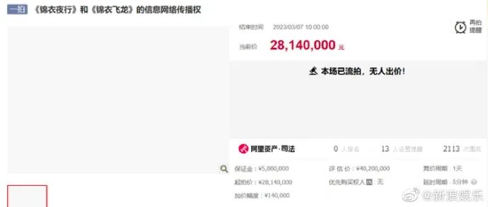 6日,北京市朝阳区人民法院公开拍卖张翰、朴敏英主演的电视剧《锦衣夜行》和《锦衣飞龙》信息网络传播权,评估价为4020万元,起拍价2814万元,但该标的最终因无人出价而流拍。