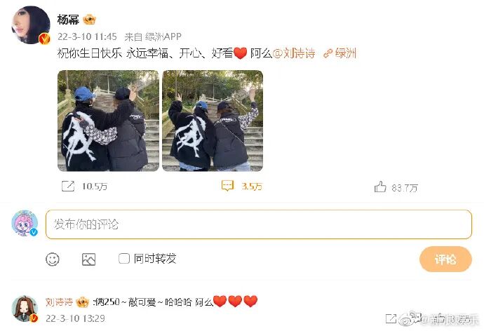 在去年给刘诗诗庆生的微博中,杨幂就甜喊“阿么”,刘诗诗为杨幂庆生也回“阿么~”美女&美女么么,友情长存!