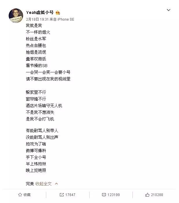 当然啦,令八太太跪了的是,爽妹子在微博小号“Yeah虚拟小号”上写的一手好打油诗。比如这样……