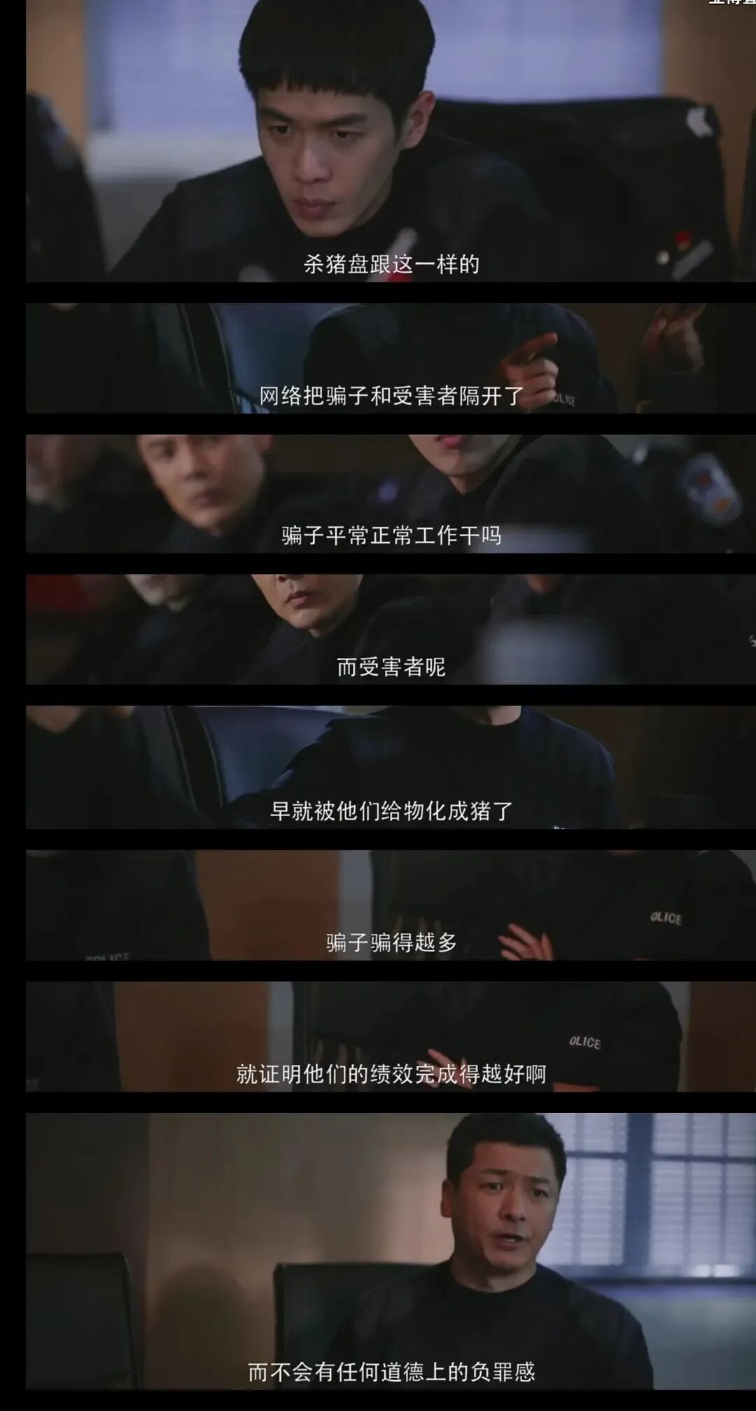 这部剧有一个好处是,还挺敢拍的。比如讲杀猪盘诈骗案那里,首次在电视剧中提出了诈骗受害者被犯罪者物化这个概念,还挺有意思的。